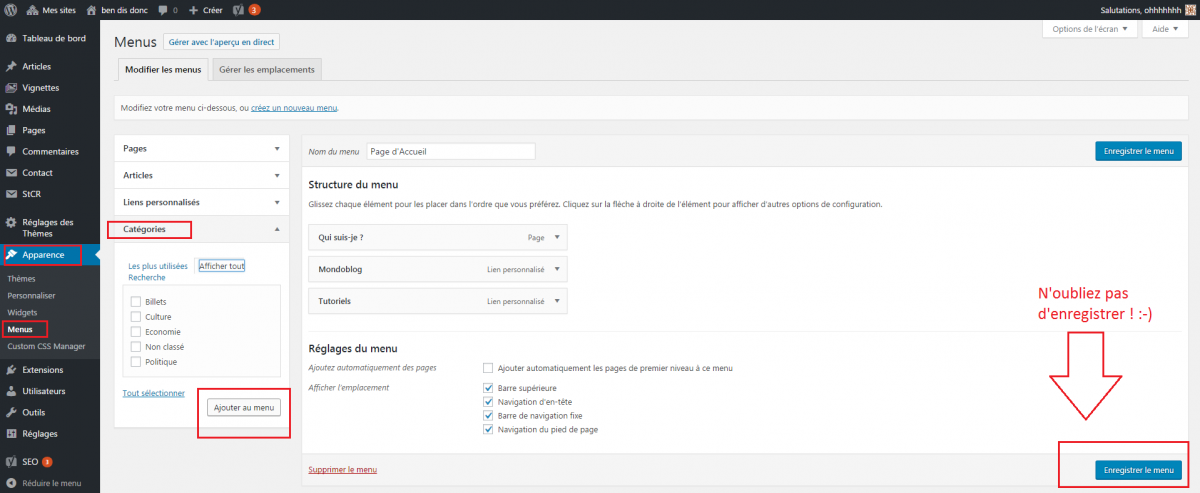 Pour cela, il faut modifier la structure du menu dans « Apparence » puis « Menus ».